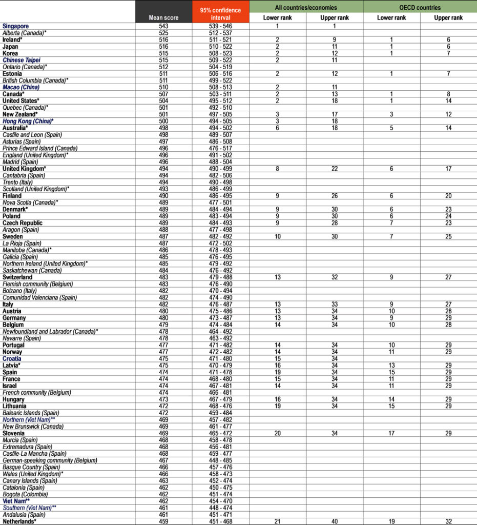 Tabel di atas menunjukan peringkat membaca di dunia yang terdaftar di PISA pada tahun 2022. Selengkapnya bisa dilihat di oecd-ilibrary.org