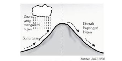 Udara basah mengalir dari permukaan laut yang mempunyai suhu sekitar 25°C naik menuju puncak gunung. Pada ketinggian sekitar 1000 m berlangsung proses adiabatik kering sehingga suhu udara turun mencapai suhu 10°C.
